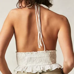 Features: Halter-style V-neckline. smocking at back. ruffled bottom hem. pleating at bust