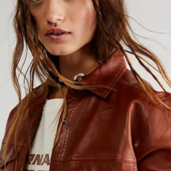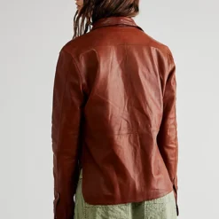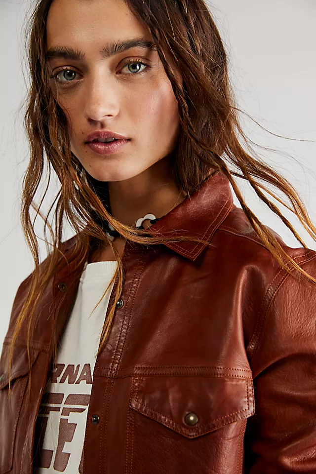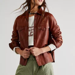Add a luxe touch to any look with this forever essential leather shirt featured in a classic button-front silhouette with double bust patch pockets and side slits at bottom for added shape.