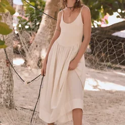 A midi made for everything. this effortless dress is featured in a soft fabrication and sleeveless silhouette with a low open back and billowy bottom skirt.