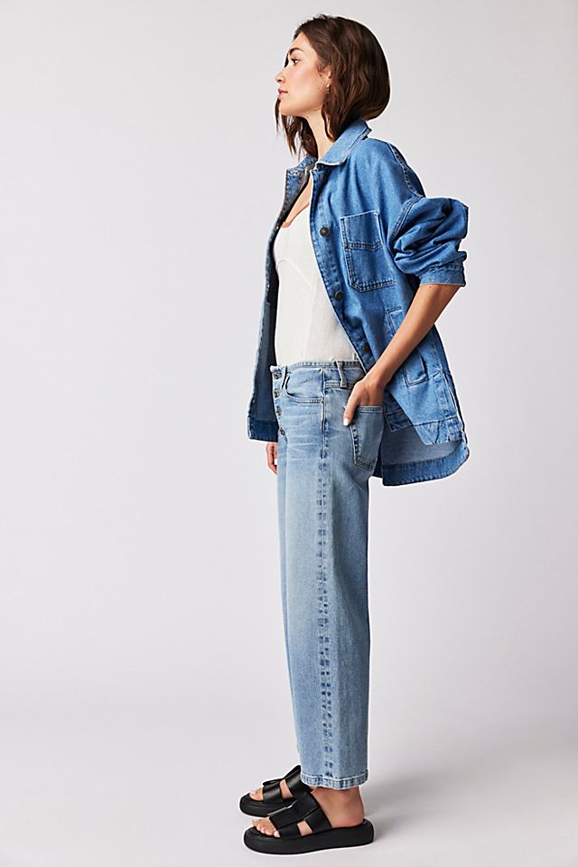 Features: Exposed button fly. five-pocket design. ankle-length inseam. semi-rigid denim
