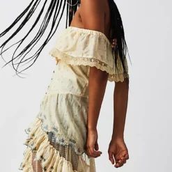 Totally timeless in an off-the-shoulder silhouette. this lace-adorned top is featured in a button-front design with sheer mesh tiers. embroidery at hems. and defined waist for a corset-inspired design.