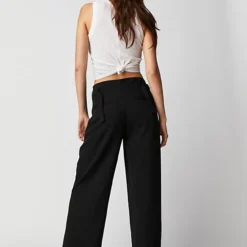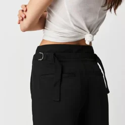 Features:: Stacked waistband. cinched waistband belt. side pockets. pleating at top