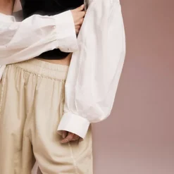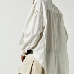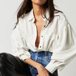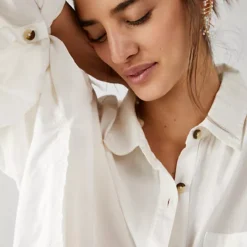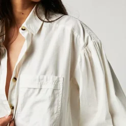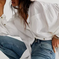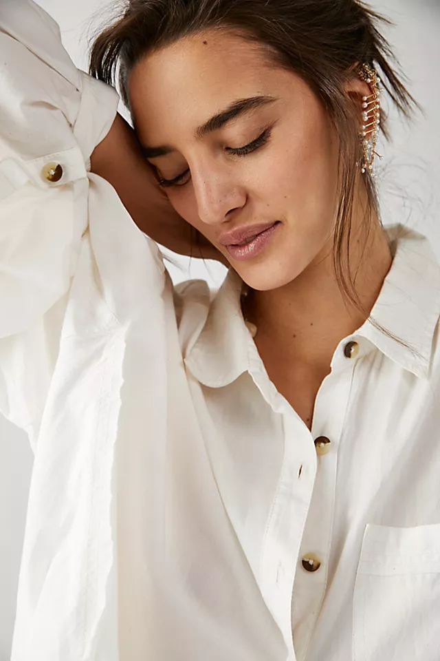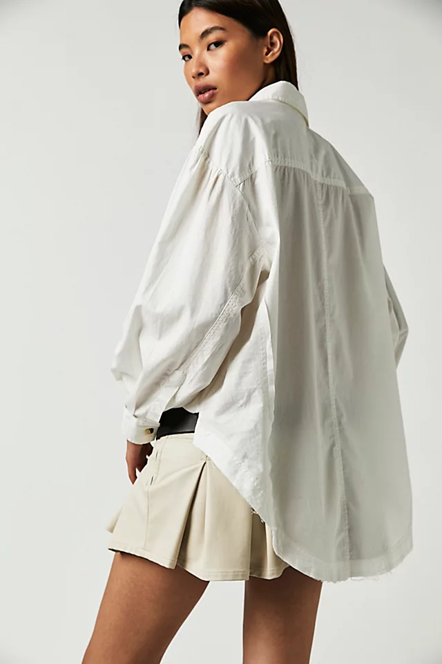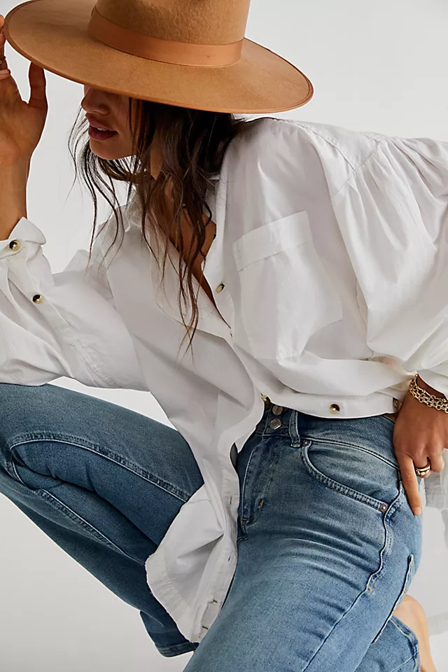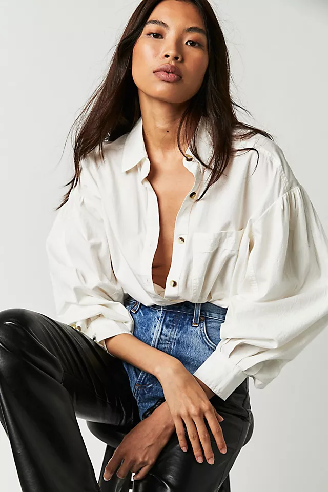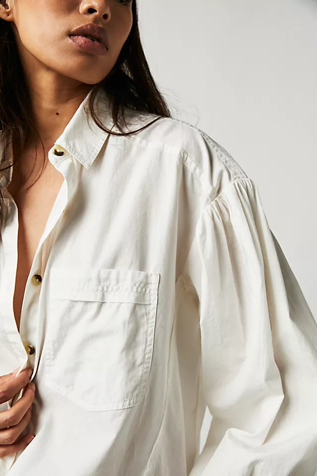 Classic and versatile button-down top featured in a boxy & oversized silhouette with dropped puff sleeves and curved bottom hem for added shape.