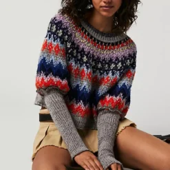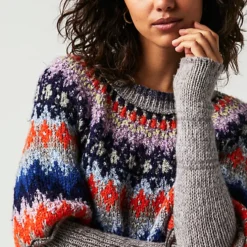 The sweater of the season featured in a timeless. multicolored knit fabrication with drapey. exaggerated sleeves and contrast bottom sleeve piecing for added dimension.