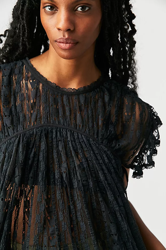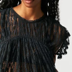 Designed to be dressed up or down. this drapey top is featured in a sheer mesh lace fabrication with flutter sleeves. tie detail at neckline. and defined seaming throughout for added dimension.
