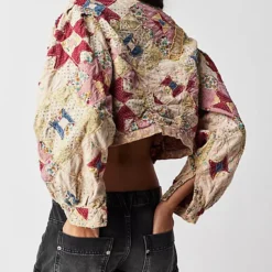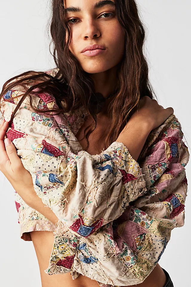 Just as versatile as it is vintage-inspired. this timeless top is featured in a quilted design and boxy. cropped fit with hook-front closure and distressed detailing throughout for a true lived-in look.