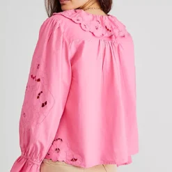 Turn heads in this timeless top featured in a button-front silhouette with exaggerated collar. lace detailing throughout. and slightly defined shoulders for added shape.