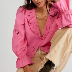 Turn heads in this timeless top featured in a button-front silhouette with exaggerated collar. lace detailing throughout. and slightly defined shoulders for added shape.