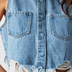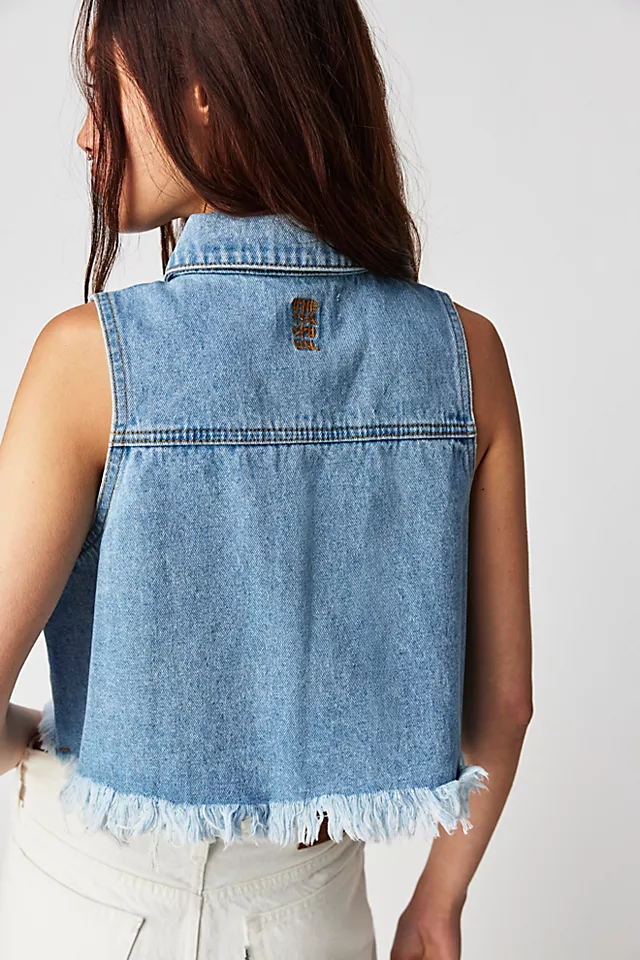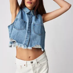 Just as cool as it is classic. this sleeveless cropped top is featured in a collared. button-front design and staple denim fabrication with raw bottom hem for a true lived-in look.