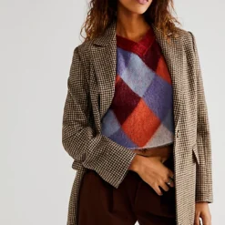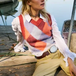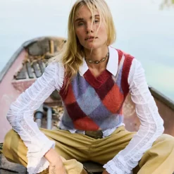 The definition of an effortless essential. this timeless sweater vest is featured in a classic. cropped silhouette and argyle print for staple style.