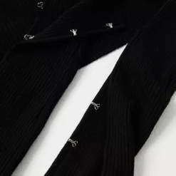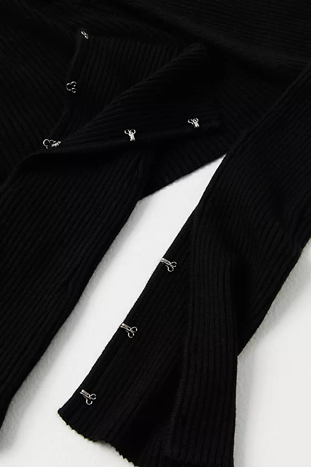 Features: Micro-cardigan silhouette. open-front design. ribbed fabrication. split sleeves. hook-and-eye details