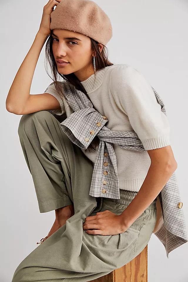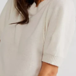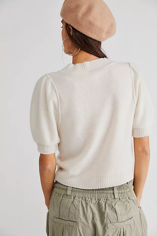 Forever classic in a gorgeous cashmere fabrication. this timeless sweater is featured in a staple silhouette with exaggerated puffed short sleeves for added shape.