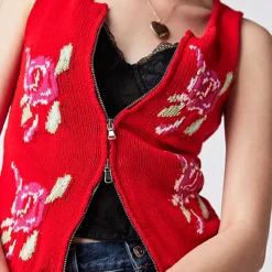 Just as versatile as it is vintage-inspired. this timeless top is featured in a vest-style silhouette and floral-adorned. knit fabrication with double zip-front closure for added ways to wear.