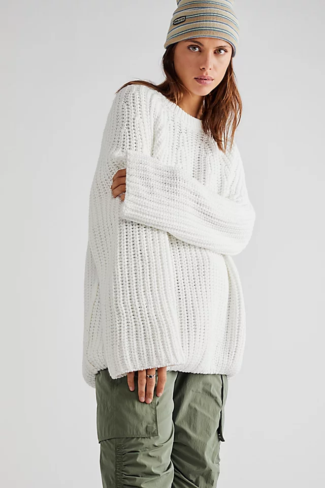 Features: Scoop neckline. classic knit design. oversized relaxed fit. slightly wide sleeves